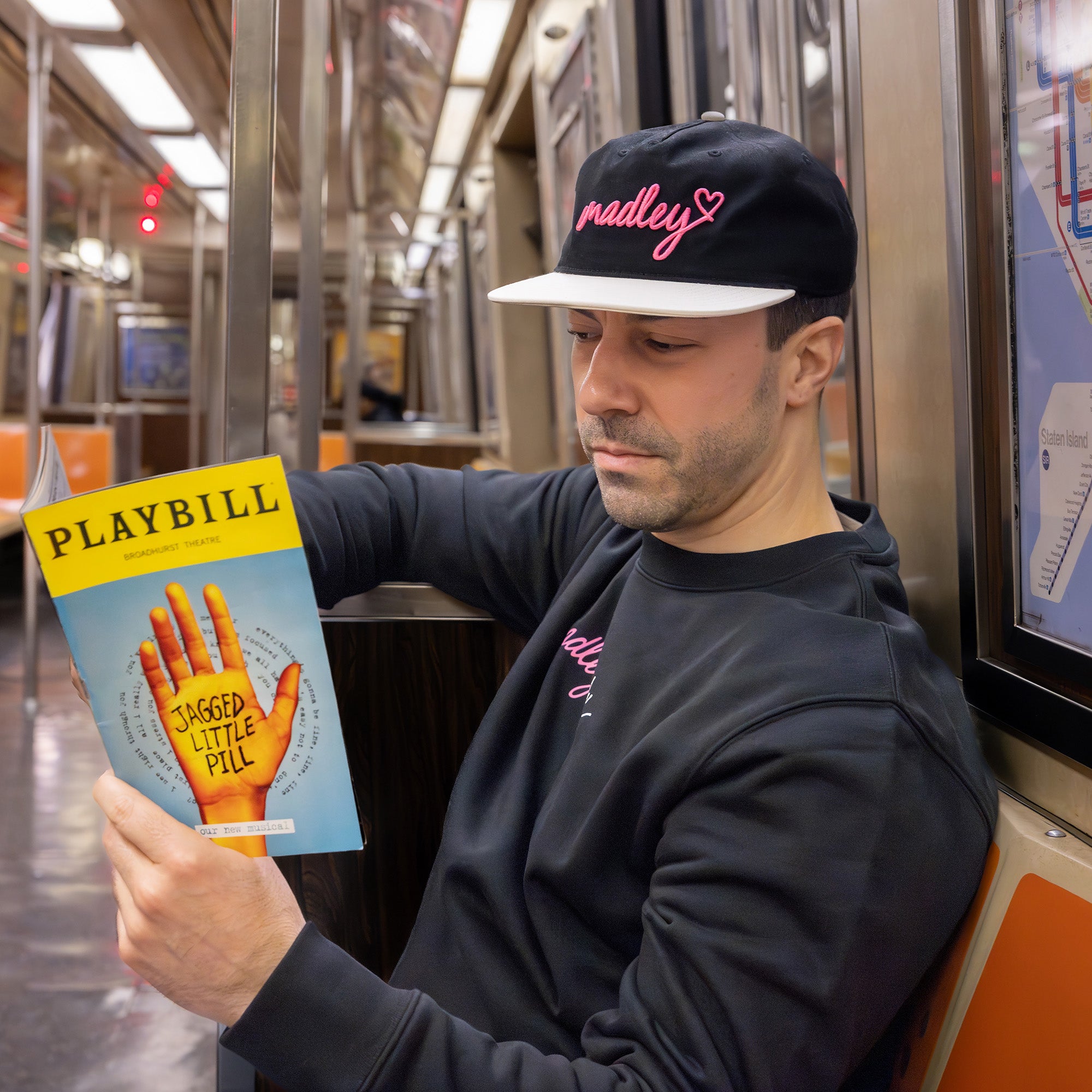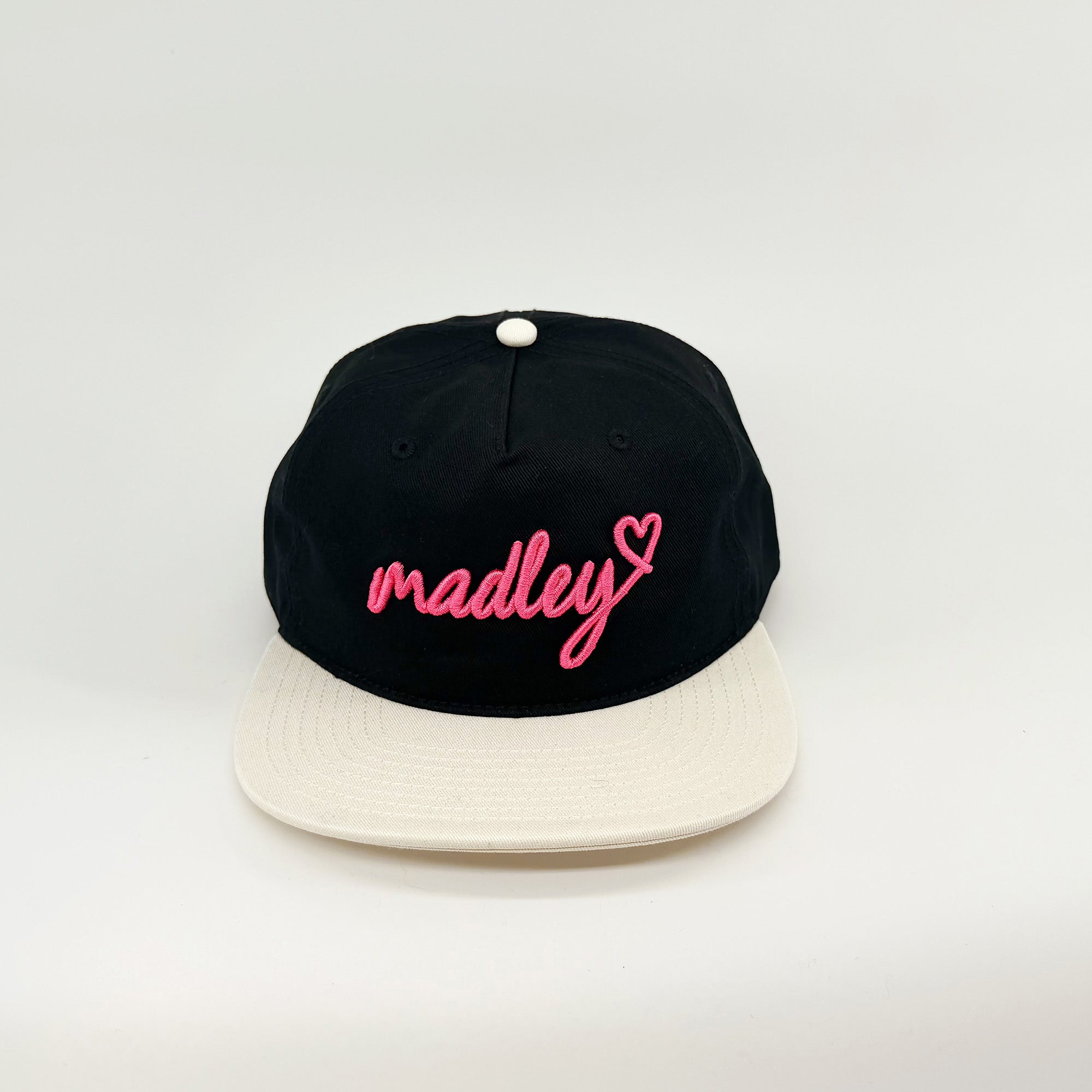 Raised puff embroidery elevates our madley classic hat (that you can also feel). Our custom madley jacquard tag side tag along with black and white color blocking completes the look for days when you’re serving face AND shade.